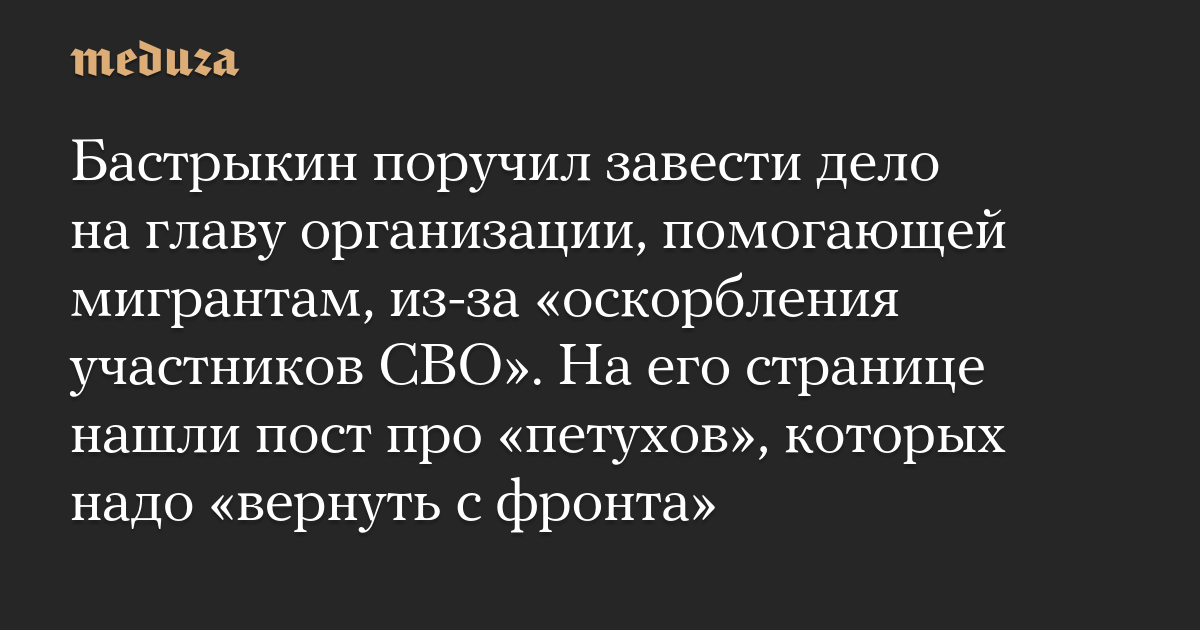 Бастрыкин поручил завести дело на главу организации, помогающей мигрантам, из-за «оскорбления участников СВО». На его странице нашли пост про «петухов», которых надо «вернуть с фронта»