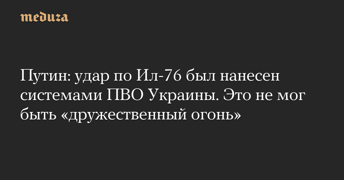 «Это не могло быть ни при каких обстоятельствах „дружественным огнем“, как в таких случаях говорят. Потому что самолет был поражен ракетами ПВО, не армейскими средствами. Это видно по элементам поражения. Наши ПВО по своему самолету по определению наносить удары не могут. Там стоят системы свой-чужой и сколько бы оператор на кнопку ни нажимал, наши системы ПВО не сработали бы. Техника. Да и средства поражения, изъятые на месте, говорят о том, что это ракета ПВО», — сказал Путин на встрече со студентами — участниками СВО.