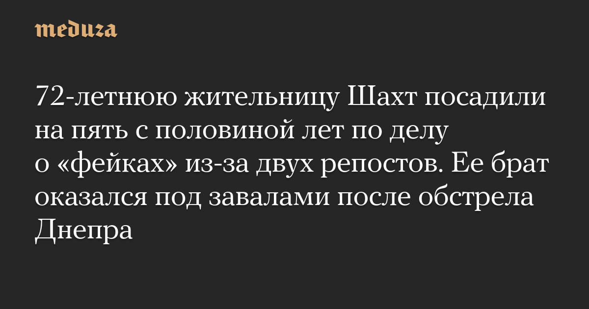 72-летнюю жительницу Шахт посадили на пять с половиной лет по делу о «фейках» из-за двух репостов. Ее брат оказался под завалами после обстрела Днепра