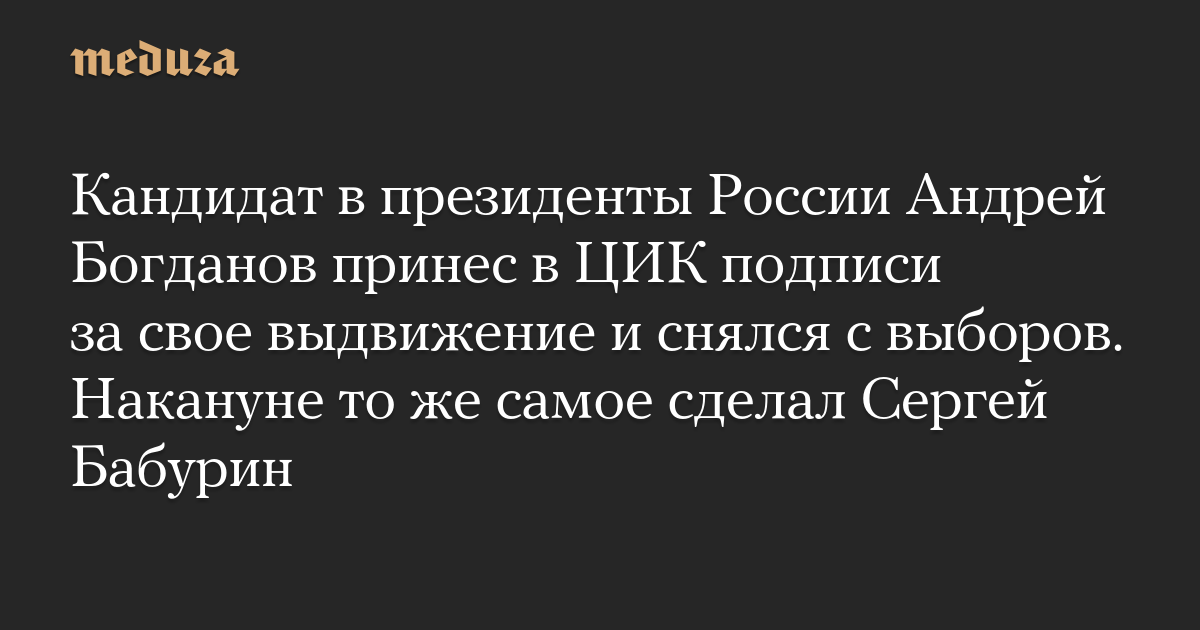 Кандидат в президенты России Андрей Богданов принес в ЦИК подписи за свое выдвижение и снялся с выборов. Накануне то же самое сделал Сергей Бабурин