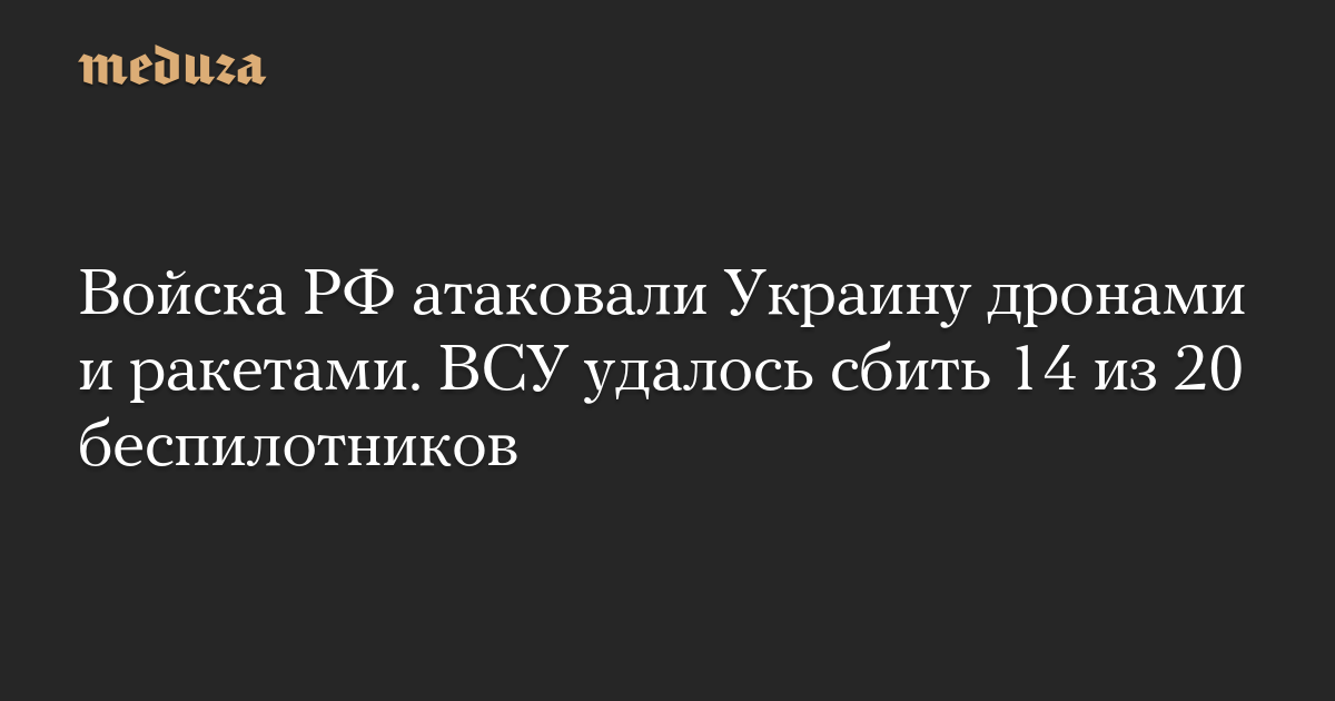 Войска РФ атаковали Украину дронами и ракетами. ВСУ удалось сбить 14 из 20 беспилотников