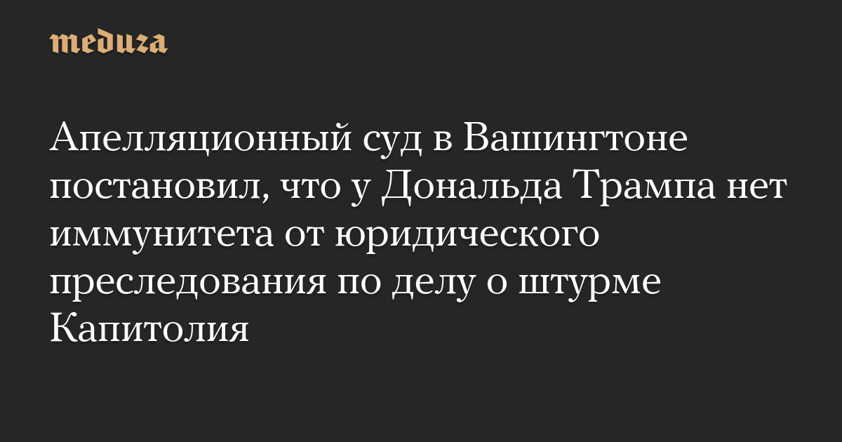 Апелляционный суд в Вашингтоне постановил, что бывший президент США Дональд Трамп не обладает иммунитетом от юридического преследования по делу о предполагаемой попытке сохранить власть после поражения на выборах 2020 года, сообщает CNN.