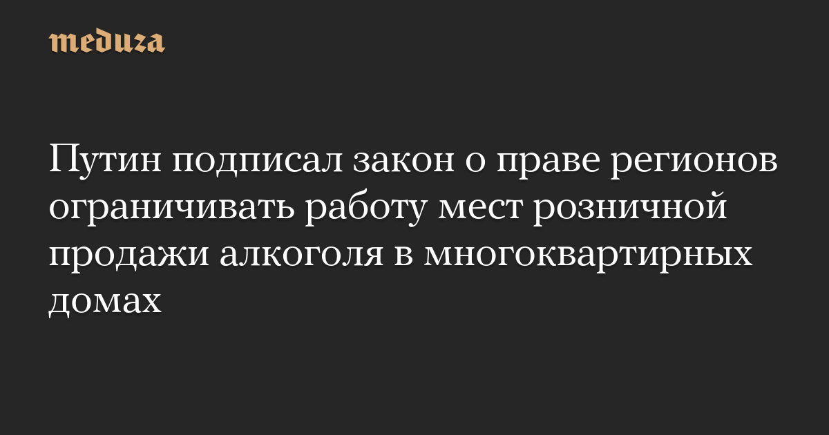 Президент РФ Владимир Путин подписал закон, наделяющий власти регионов правом ограничивать работу мест розничной продажи алкоголя в многоквартирных домах — так называемых наливаек.
