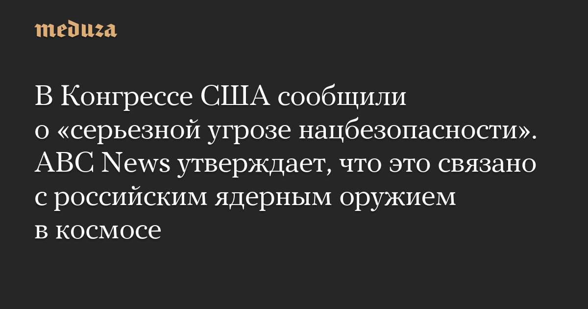 В Конгрессе США сообщили о «серьезной угрозе нацбезопасности». ABC News утверждает, что это связано с российским ядерным оружием в космосе