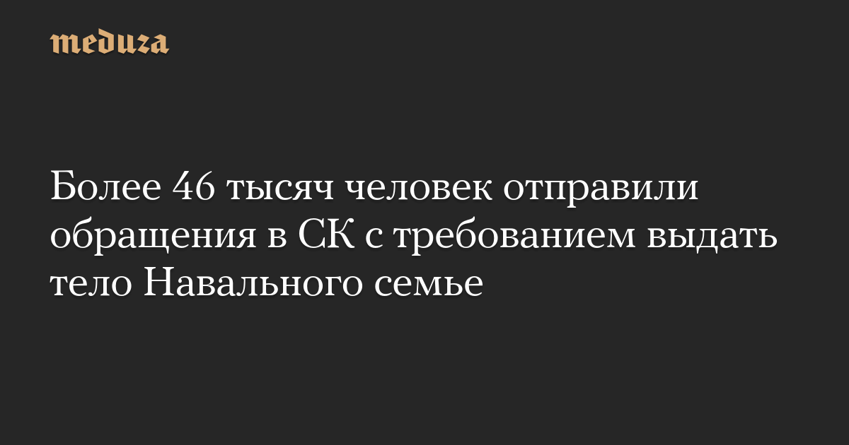 Менее чем за двое суток более 46 тысяч человек отправили обращения в Следственный комитет РФ с требованием выдать тело Алексея Навального его семье.