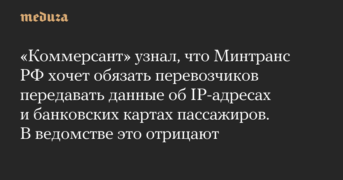 «Коммерсант» узнал, что Минтранс РФ хочет обязать перевозчиков передавать данные об IP-адресах и банковских картах пассажиров. В ведомстве это отрицают