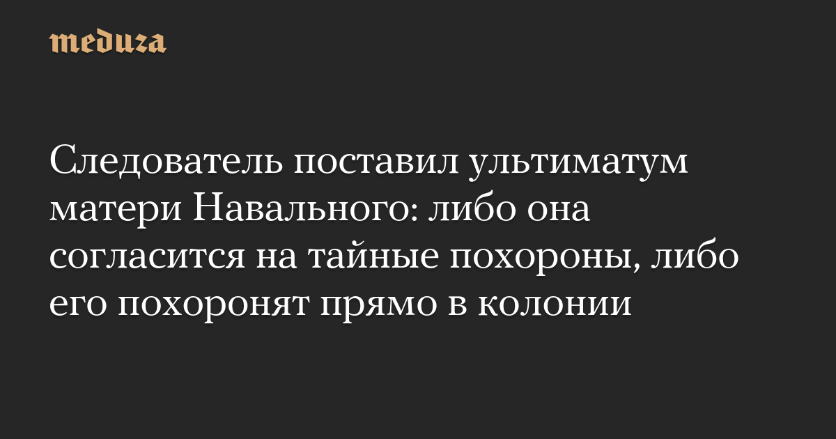 Следователь поставил ультиматум матери Алексея Навального, потребовав от нее в течение трех часов согласиться на тайные похороны политика без публичного прощания. Об этом сообщили соратники Навального Кира Ярмыш и Иван Жданов.