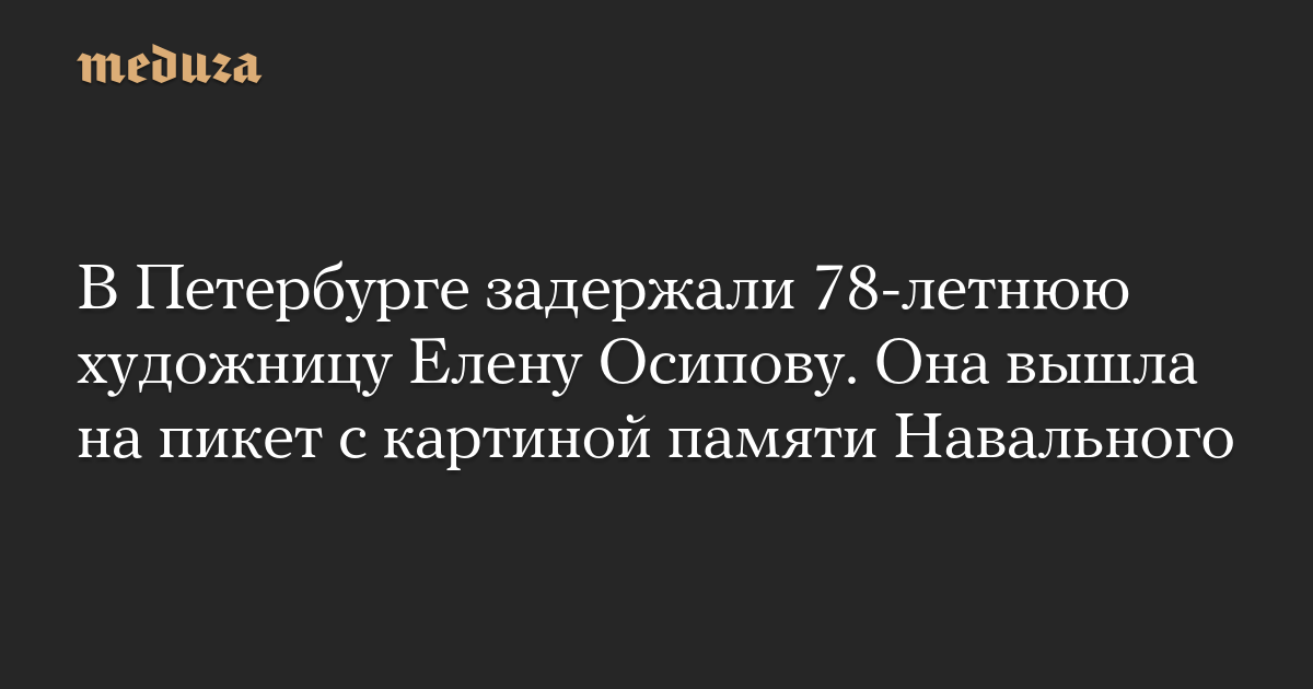 Полиция Петербурга задержала 78-летнюю художницу Елену Осипову, которая вышла с одиночным пикетом в память об Алексее Навальном, который умер в колонии, сообщает «Бумага». Осипова встала с плакатом «Алексей Навальный. Остановите операции Путина» возле Екатерининского сквера на площади Островского.
