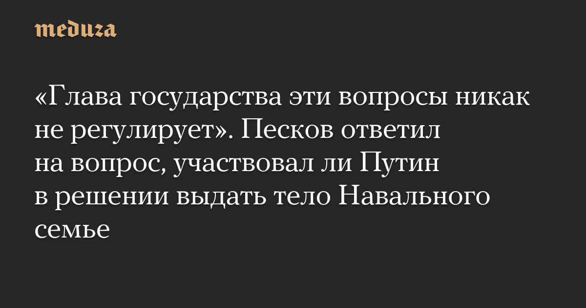 «Глава государства эти вопросы никак не регулирует». Песков ответил на вопрос, участвовал ли Путин в решении выдать тело Навального семье