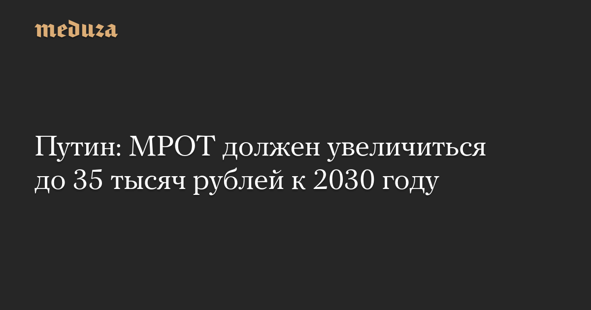 «Начиная с 2020 года, МРОТ вырос в полтора раза — с 12 до 19 тысяч рублей в месяц. К 2030 году МРОТ должен увеличиться еще почти вдвое — до 35 тысяч», — сказал Путин.