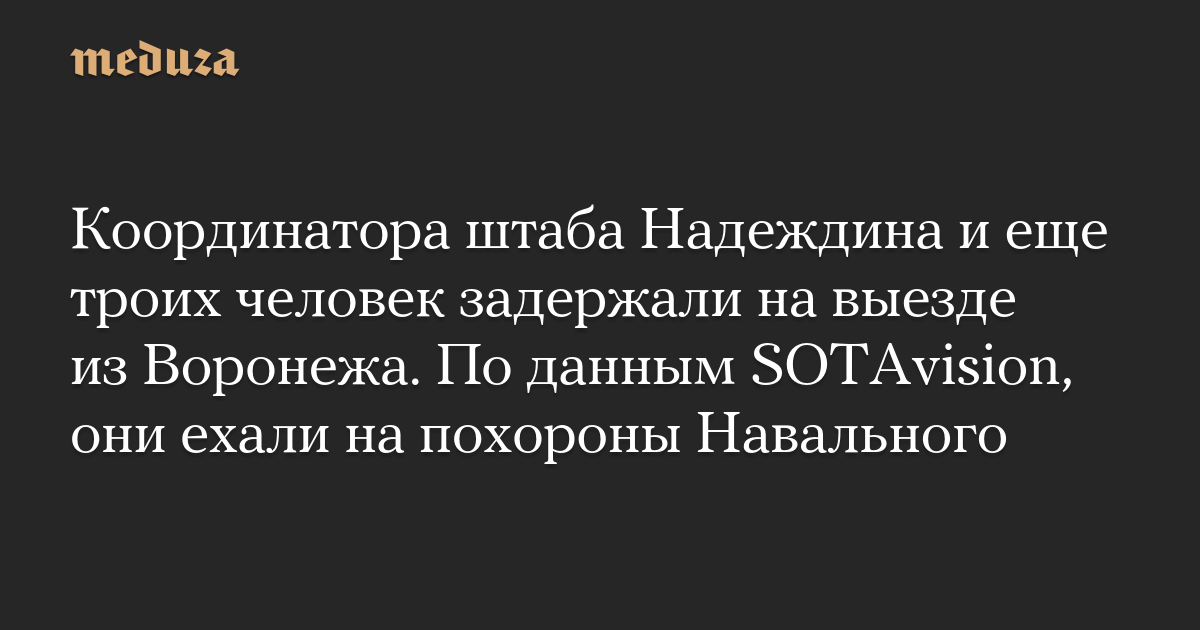 Координатора штаба Надеждина и еще троих человек задержали на выезде из Воронежа. По данным SOTAvision, они ехали на похороны Навального
