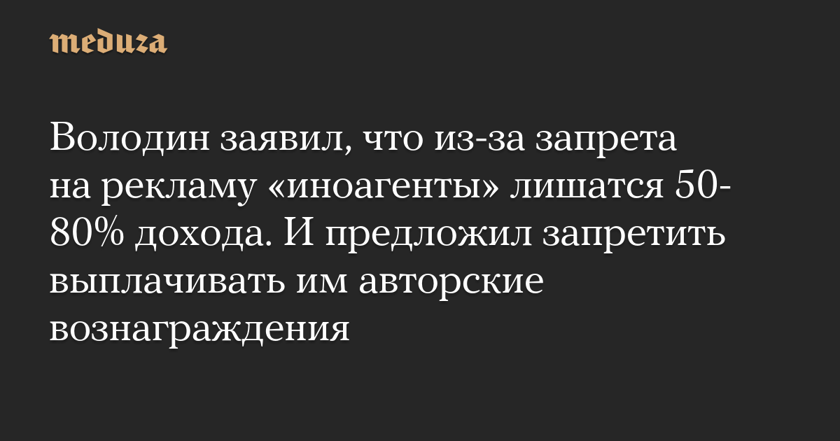 Володин заявил, что из-за запрета на рекламу «иноагенты» лишатся 50-80% дохода. И предложил запретить выплачивать им авторские вознаграждения