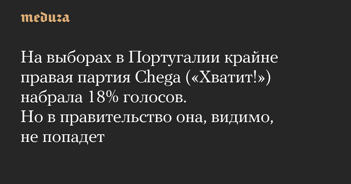 На выборах в Португалии крайне правая партия Chega («Хватит!») набрала 18% голосов. Но в правительство она, видимо, не попадет