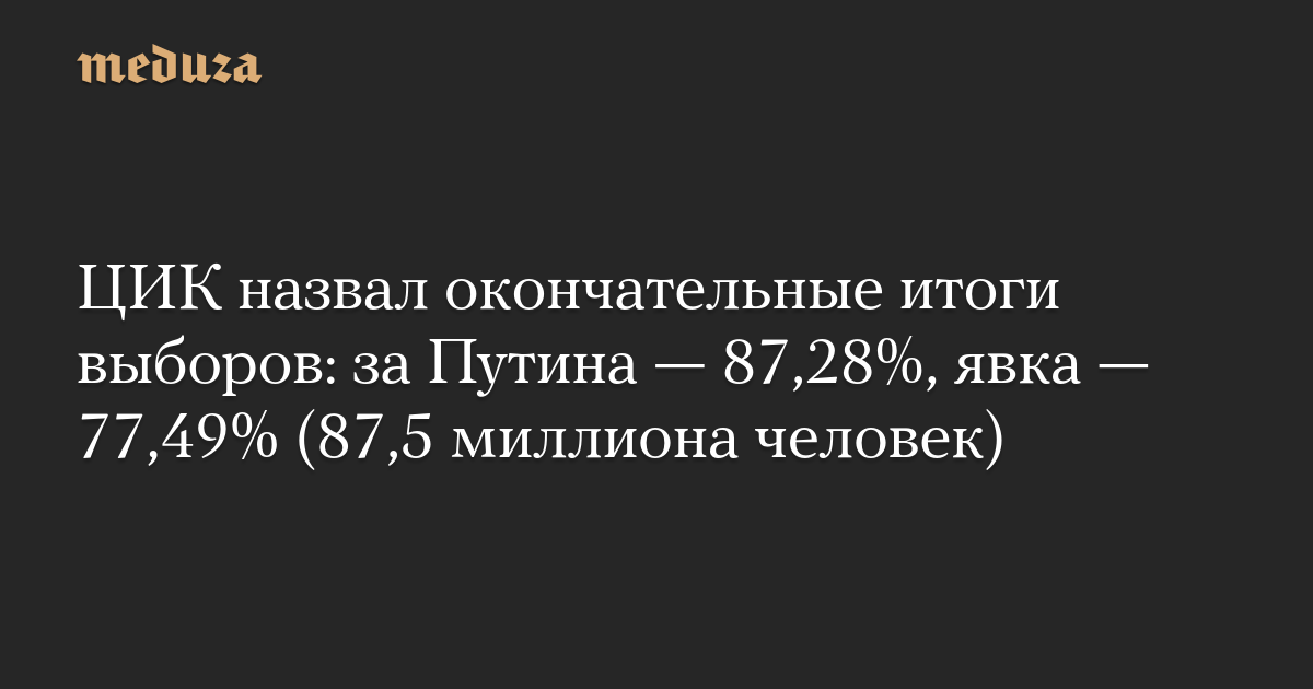 ЦИК назвал окончательные итоги выборов: за Путина — 87,28%, явка — 77,49% (87,5 миллиона человек)
