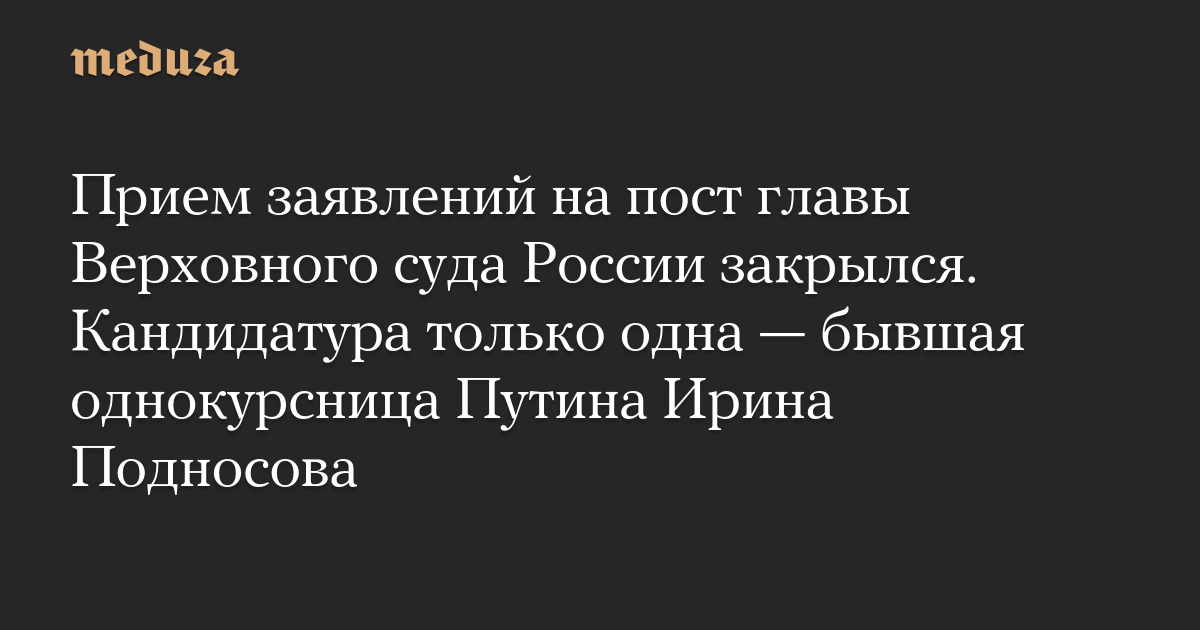 Прием заявлений на пост главы Верховного суда России закрылся. Кандидатура только одна — бывшая однокурсница Путина Ирина Подносова