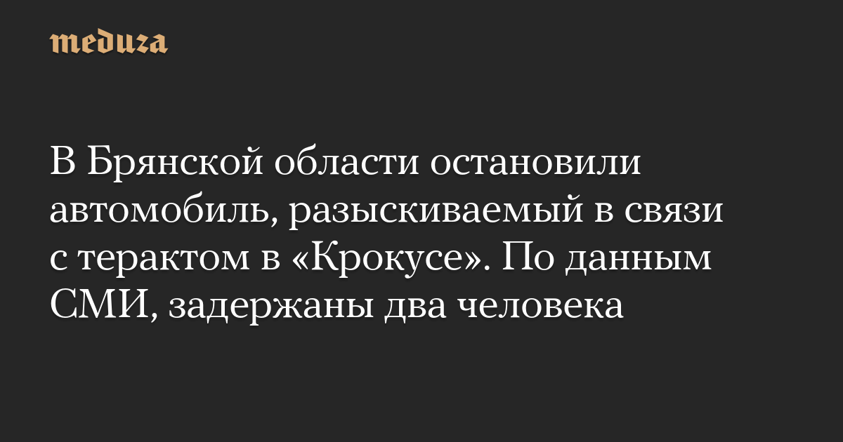 Сотрудники правоохранительных органов остановили в Брянской области автомобиль, который разыскивали в связи с терактом в концертном зале «Крокус Сити Холл», сообщили телеграм-каналы Baza и «Осторожно, новости». Другие источники пока не подтверждали эту информацию. Власти это не подтверждали.