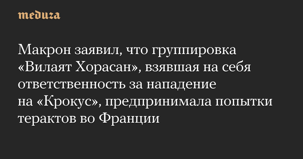 Ячейка ИГИЛ под названием «Вилаят Хорасан», взявшая на себя ответственность за нападение на «Крокус Сити Холл», ранее предприняла «несколько попыток» терактов во Франции, заявил президент республики Эммануэль Макрон.