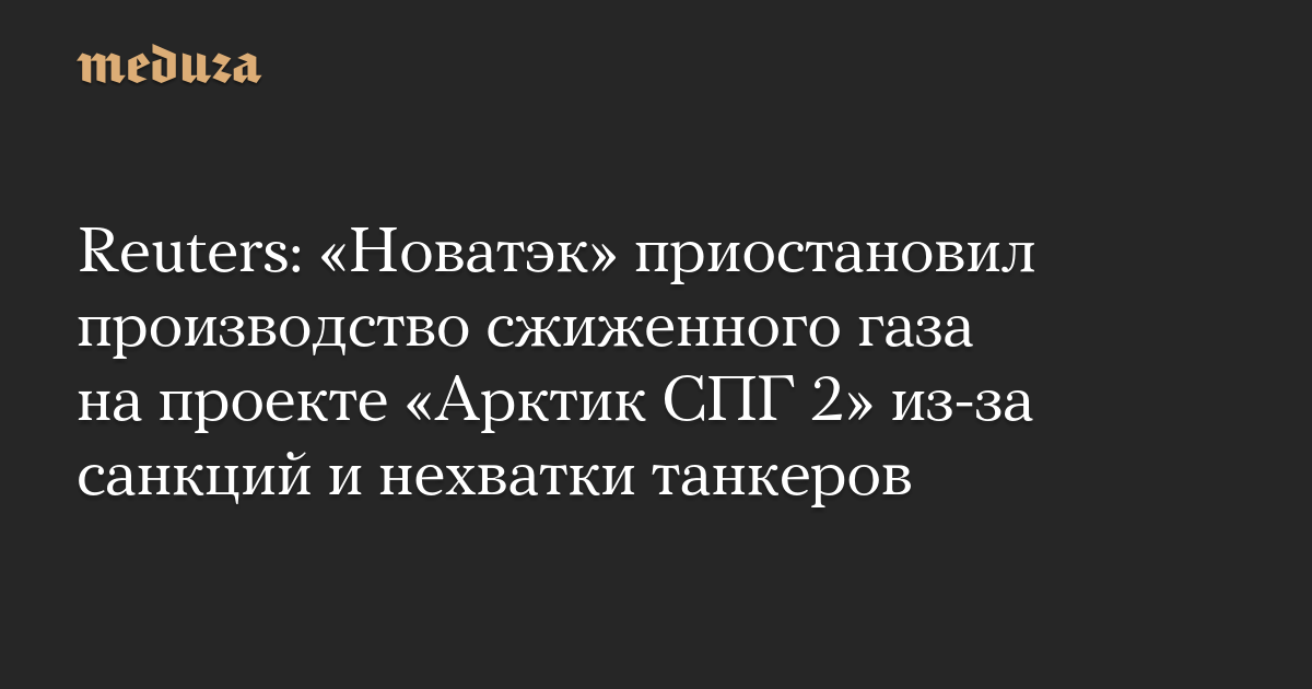 Компания «Новатэк» приостановила производство сжиженного природного газа (СПГ) на своем проекте «Арктик СПГ 2» из-за санкций и нехватки танкеров, пишет Reuters со ссылкой на два источника в отрасли.