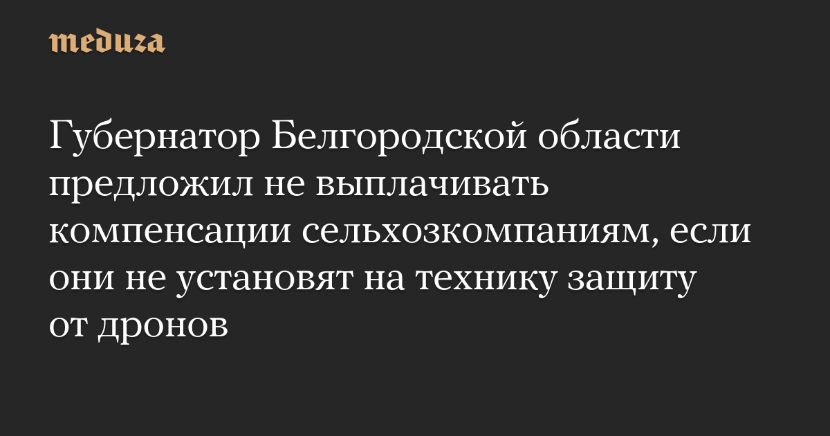 Губернатор Белгородской области предложил не выплачивать компенсации сельхозкомпаниям, если они не установят на технику защиту от дронов