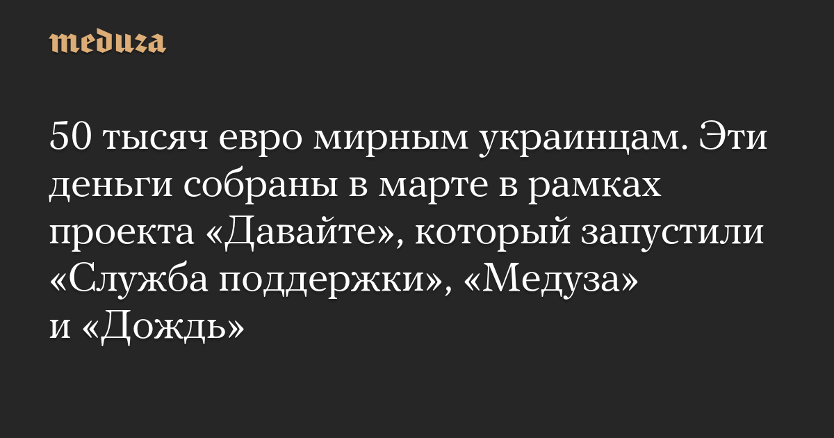 50 тысяч евро мирным украинцам. Эти деньги собраны в марте в рамках проекта «Давайте», который запустили «Служба поддержки», «Медуза» и «Дождь»