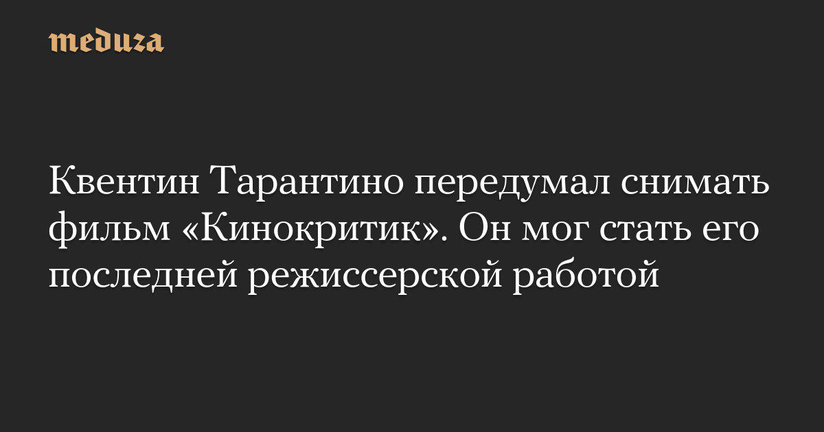 Режиссер Квентин Тарантино больше не планирует снимать фильм «Кинокритик», начало производства которого намечалось на август. Первым об этом сообщило издание Deadline, об этом же написали The Hollywood Reporter и Variety, все они сослались на источники. Тарантино это не комментировал.