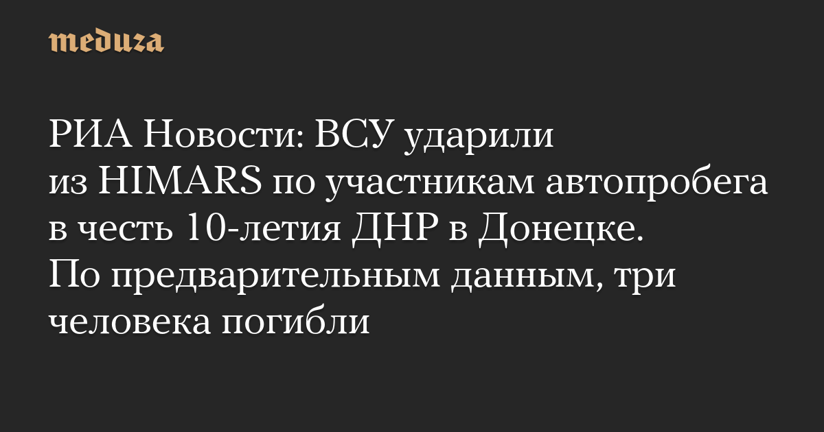 РИА Новости: ВСУ ударили из HIMARS по участникам автопробега в честь 10-летия ДНР в Донецке. По предварительным данным, три человека погибли