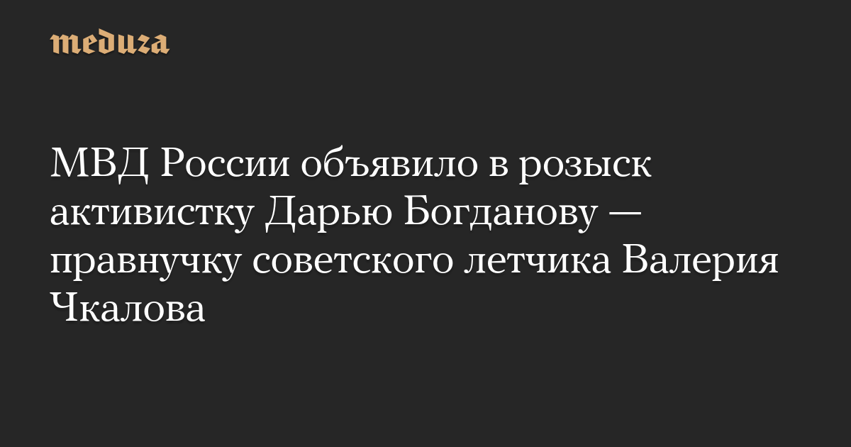 МВД России объявило в розыск Дарью Богданову — активистку проекта Freedom Birds for Ukraine и правнучку советского летчика Валерия Чкалова. Внимание на карточку розыска обратила «Медиазона».