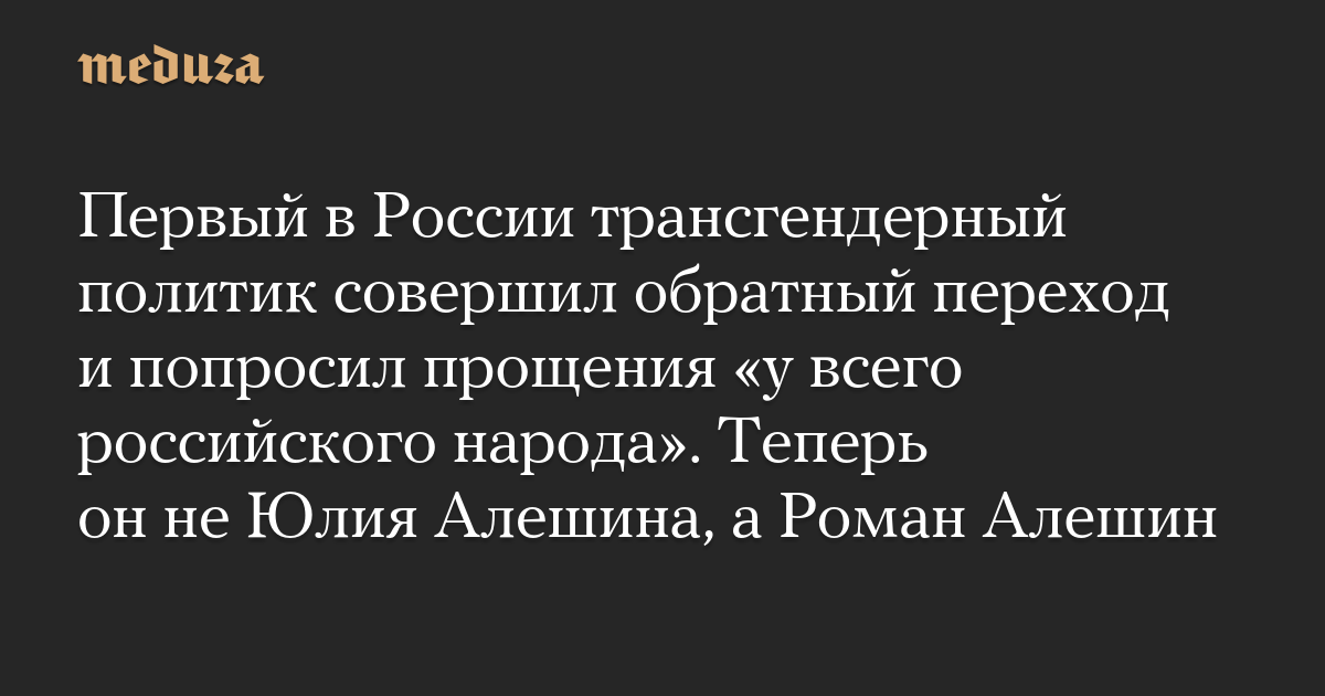 Роман Алешин — ранее его называли первым российским трансгендерным политиком Юлией Алешиной — совершил обратный переход и попросил прощения «у всего российского народа». В интервью местному изданию политик уже под мужским именем говорит, что «разочаровался в либеральной идеологии».