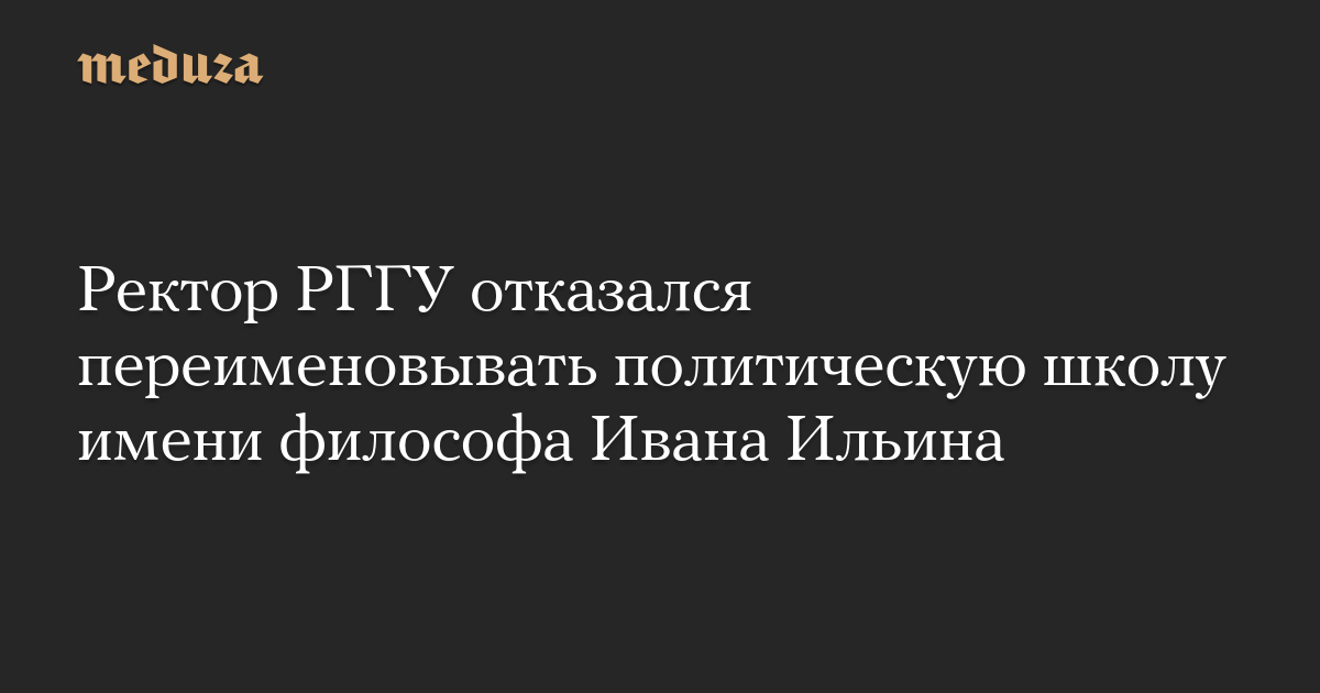 Ректор РГГУ Александр Безбородов отклонил запрос депутата Госдумы от КПРФ Дениса Парфенова о переименовании политической школы имени философа Ивана Ильина. В запросе, отправленном в РГГУ, Парфенов напоминал, что против того, чтобы школа носила имя Ильина, выступают студенты вуза, составившие соответствующую петицию.