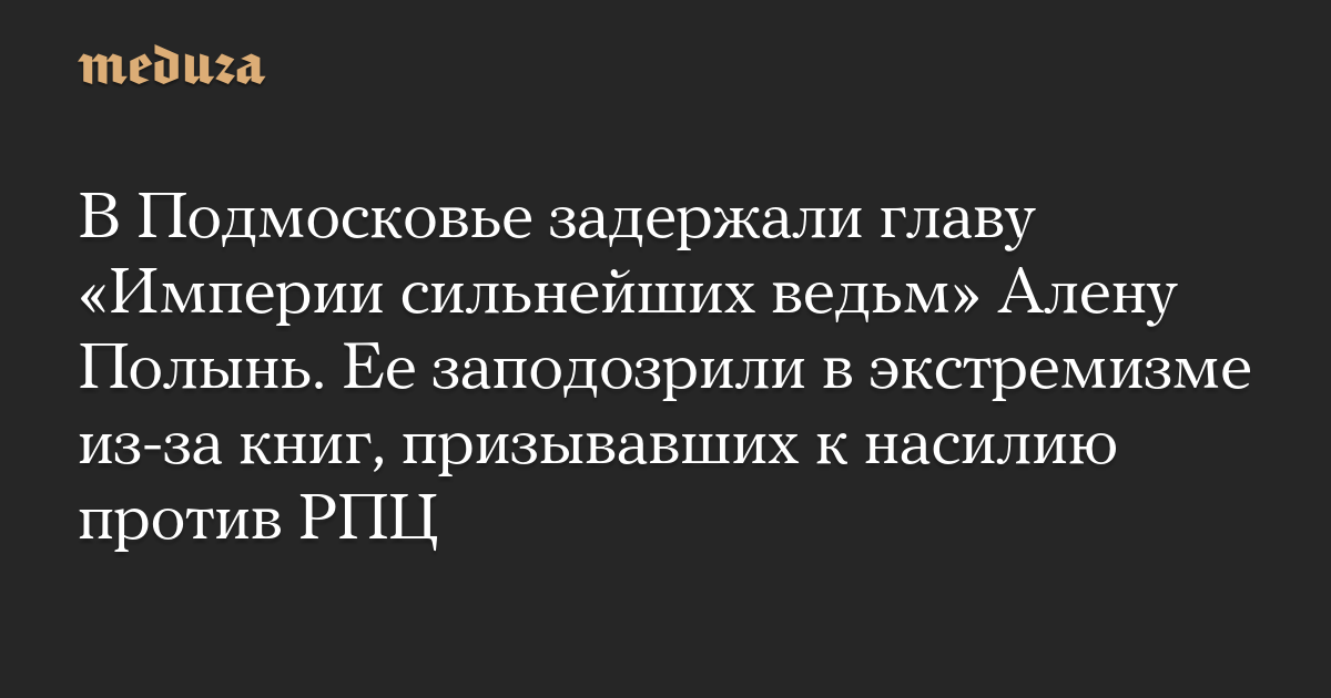 В Подмосковье задержали главу «Империи сильнейших ведьм» Алену Полынь. Ее заподозрили в экстремизме из-за книг, призывавших к насилию против РПЦ
