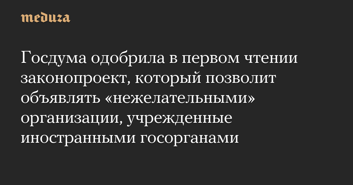 Госдума одобрила в первом чтении законопроект, который позволит объявлять «нежелательными» организации, учрежденные иностранными госорганами