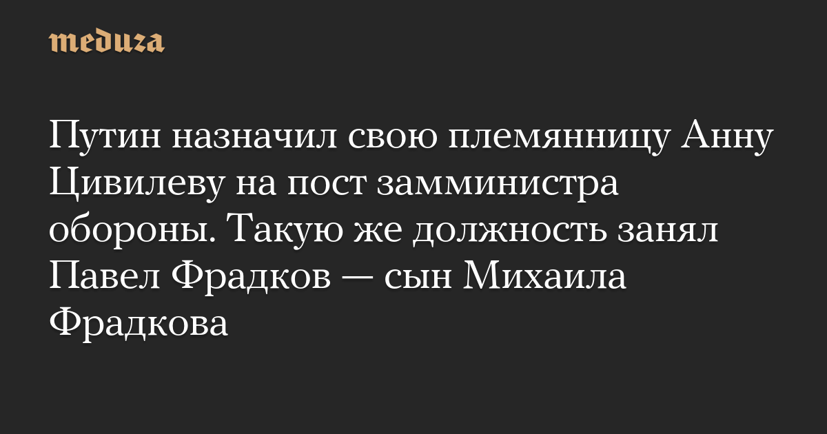 Путин назначил свою племянницу Анну Цивилеву на пост замминистра обороны. Такую же должность занял Павел Фрадков — сын Михаила Фрадкова