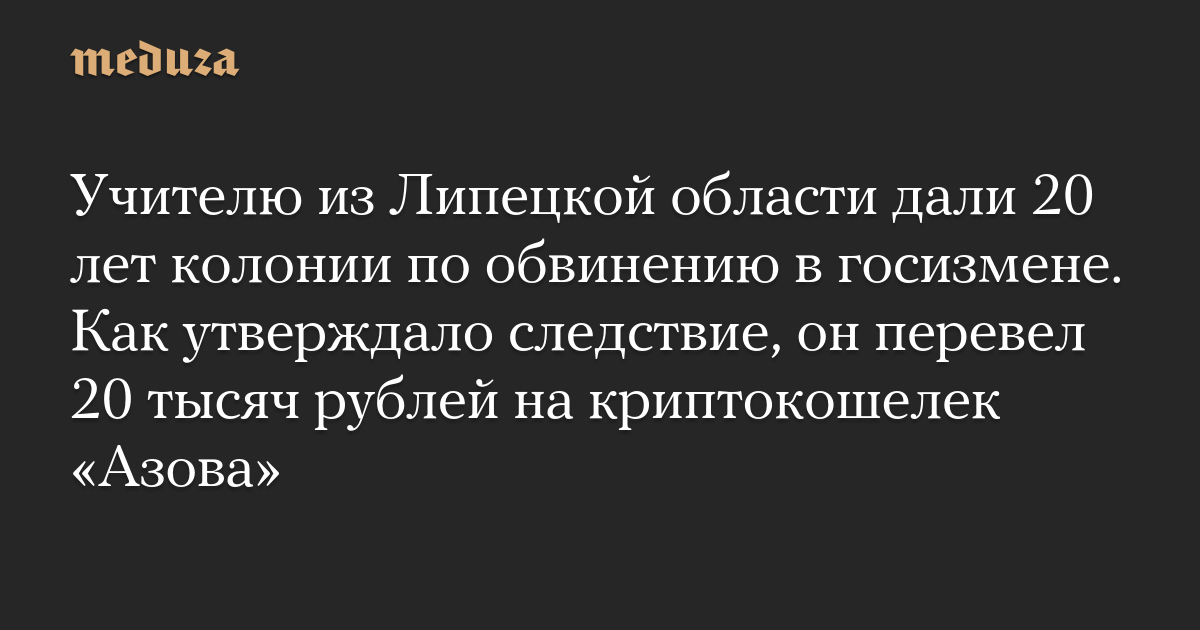Учителю из Липецкой области дали 20 лет колонии по обвинению в госизмене. Как утверждало следствие, он перевел 20 тысяч рублей на криптокошелек «Азова»