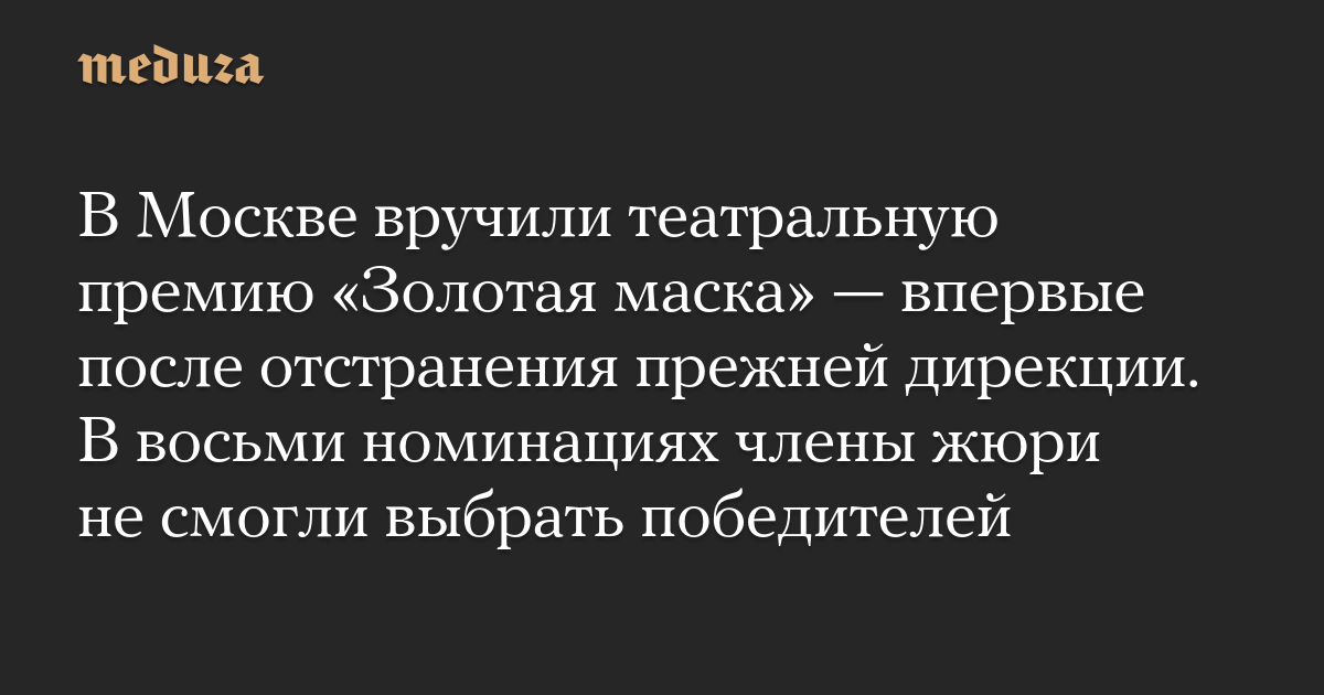 В Москве вручили театральную премию «Золотая маска» — впервые после отстранения прежней дирекции. В восьми номинациях члены жюри не смогли выбрать победителей