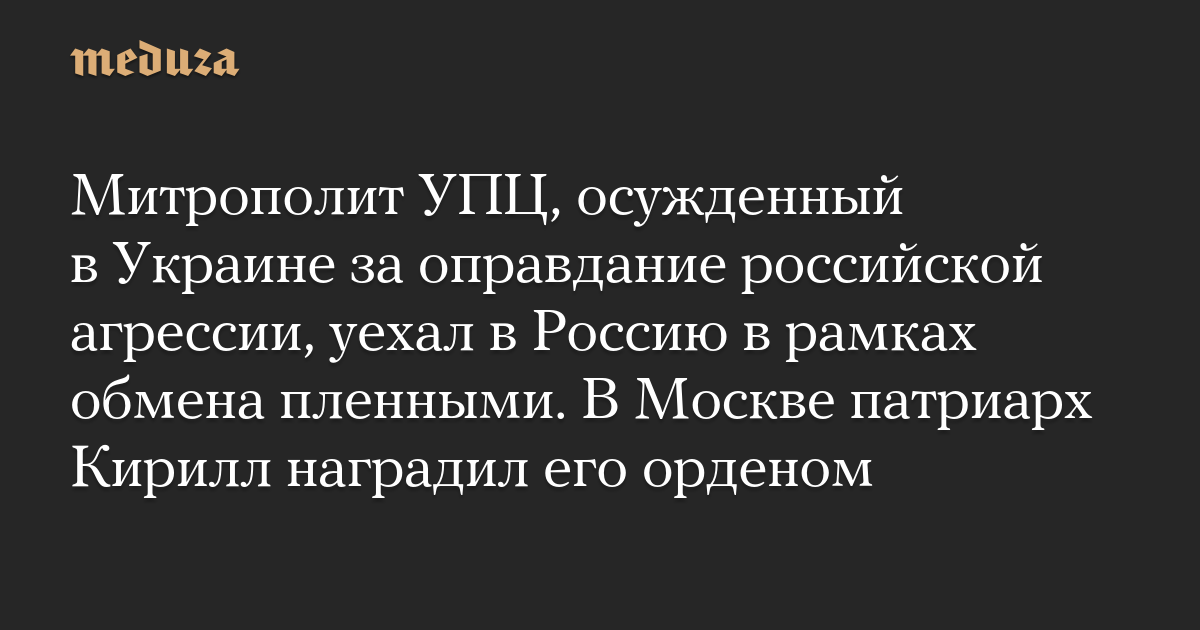 Митрополит УПЦ, осужденный в Украине за оправдание российской агрессии, уехал в Россию в рамках обмена пленными. В Москве патриарх Кирилл наградил его орденом