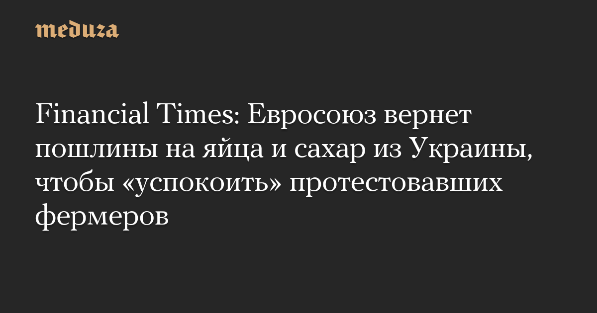 FT напомнила, что на прошлой неделе были восстановлены пошлины в размере 89 евро за тонну украинского овса, которые будут действовать до июня 2025 года. Аналогичные решения по сахару и яйцам планируется объявить 28 июня.