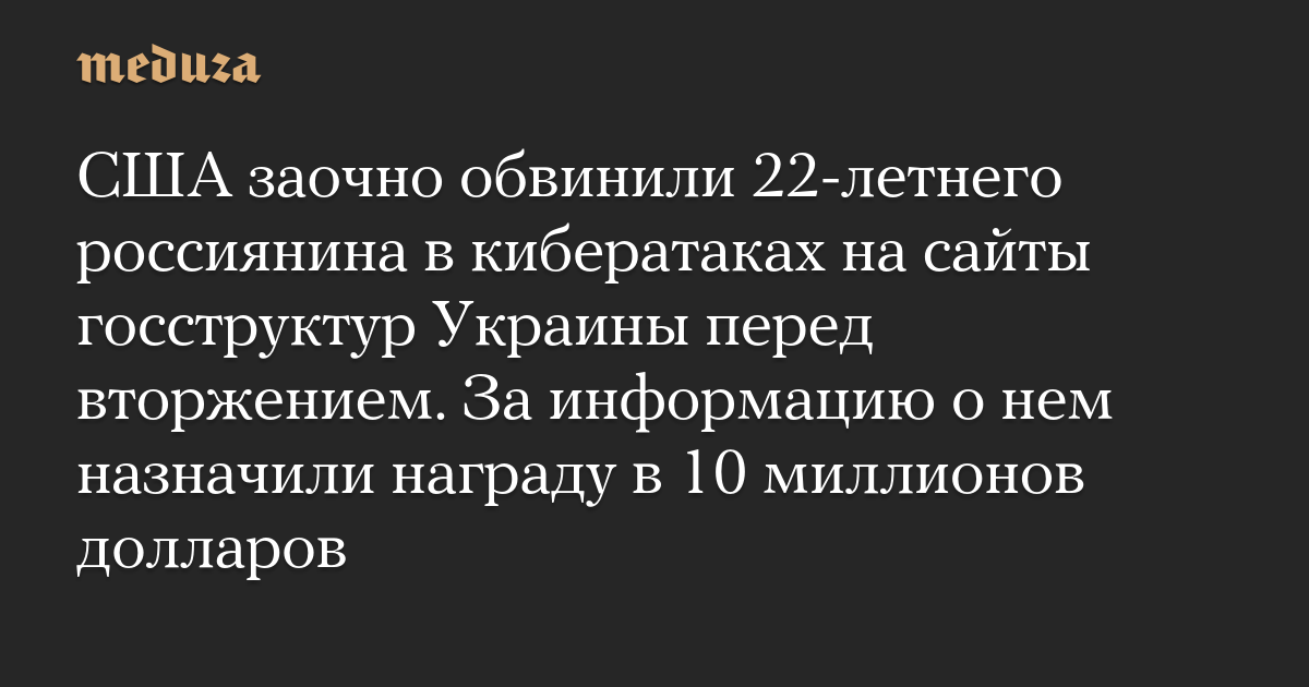 США заочно обвинили 22-летнего россиянина в кибератаках на сайты госструктур Украины перед вторжением. За информацию о нем назначили награду в 10 миллионов долларов