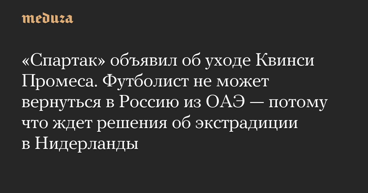 Московский «Спартак» объявил о прекращении контракта с нидерландским нападающим Квинси Промесом, который находится в ОАЭ, ожидая рассмотрения дела об экстрадиции в Нидерланды.