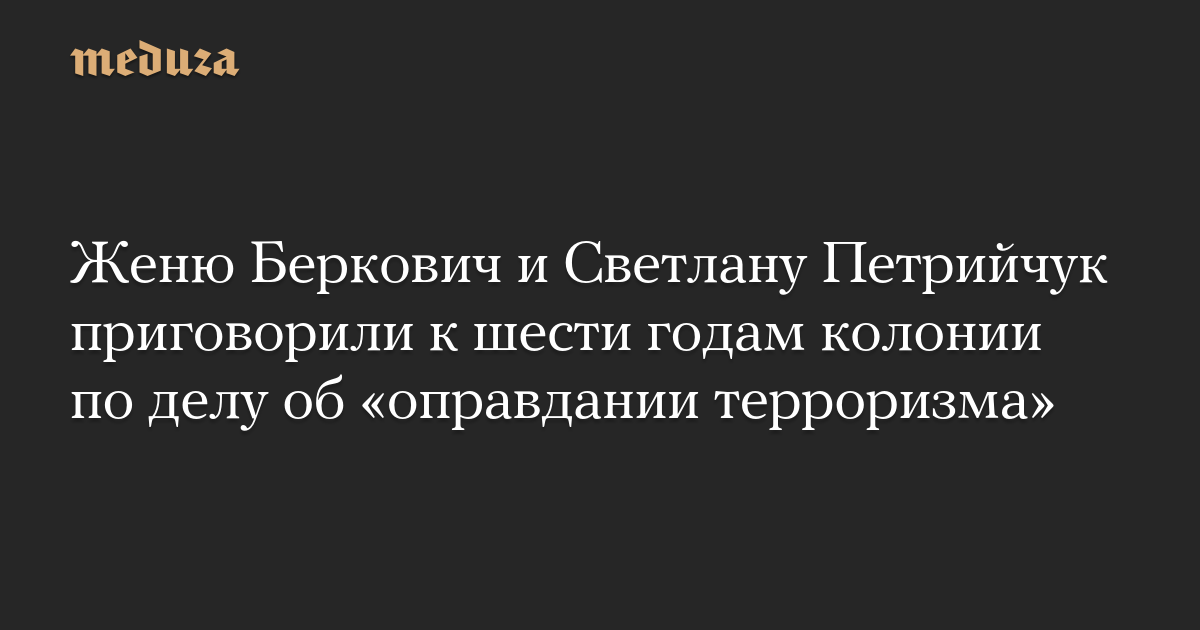 Судья 2-го Западного окружного военного суда Юрий Массин приговорил режиссерку Женю Беркович и драматурга Светлану Петрийчук к шести годам лишения свободы по делу об «оправдании терроризма» (часть 2 статьи 205.2 УК). Об этом «Медузе» сообщил слушатель в зале суда.