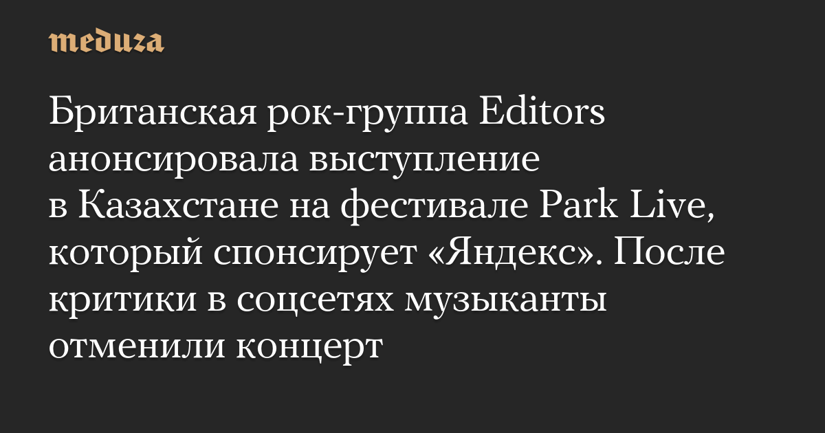 Британская рок-группа Editors анонсировала выступление в Казахстане на фестивале Park Live, который спонсирует «Яндекс». После критики в соцсетях музыканты отменили концерт