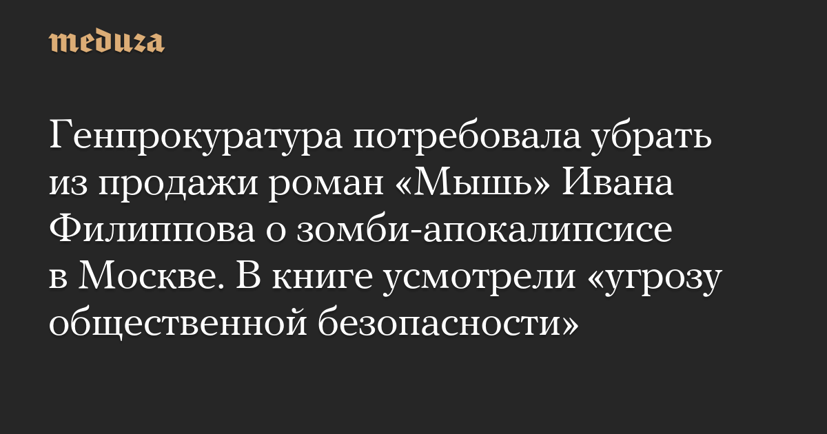 Генпрокуратура потребовала убрать из продажи роман «Мышь» Ивана Филиппова о зомби-апокалипсисе в Москве. В книге усмотрели «угрозу общественной безопасности»
