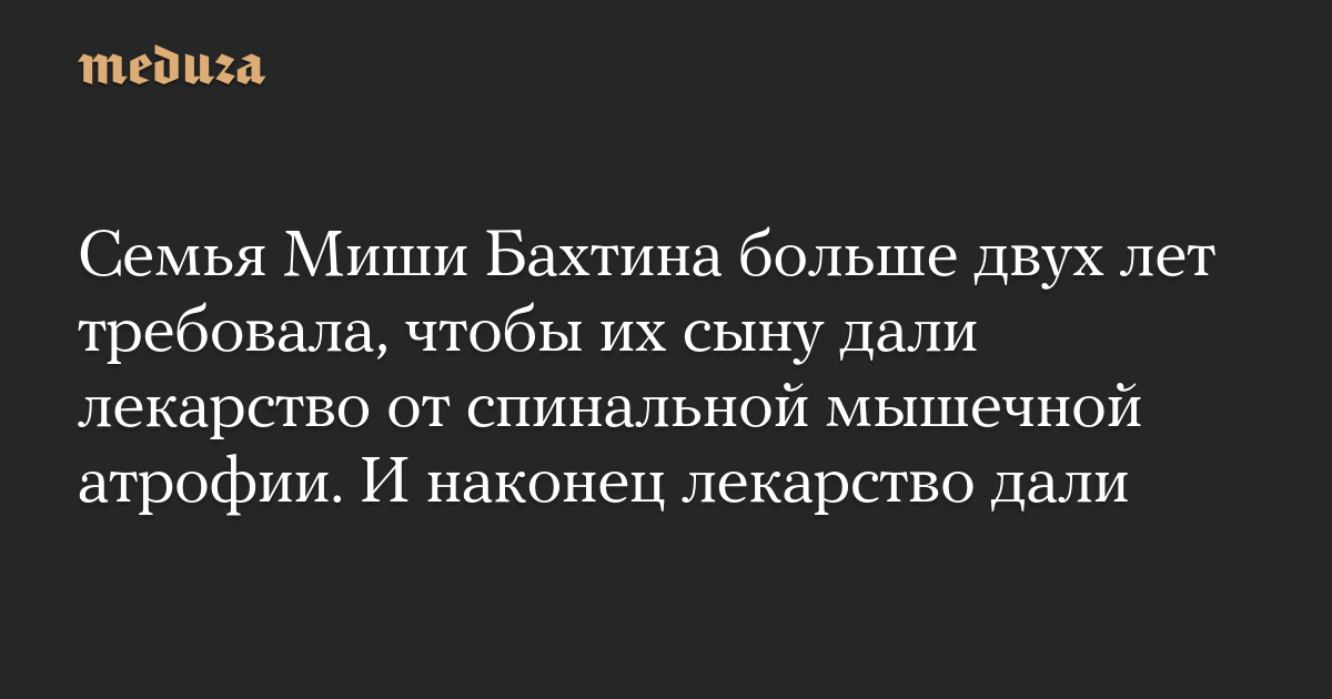 Родители Миши Бахтина в апреле 2021 года начали через суд добиваться от регионального Минздрава, чтобы их сына обеспечили лекарствами. В марте 2022 года суд обязал Минздрав обеспечить ребенка «Спинразой», но мальчик не получил лекарство. Врачи в октябре 2023 года без ведома родителей провели консилиум и решили отменить назначение «Спинразы».