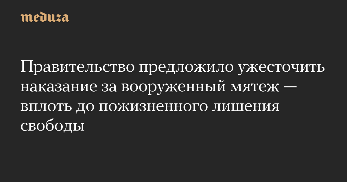 Правительство России внесло в Госдуму законопроект, который предполагает ужесточение уголовного наказания за вооруженный мятеж вплоть до пожизненного лишения свободы. Документ опубликован на сайте нижней палаты парламента.