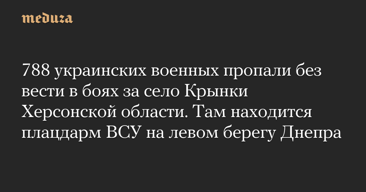 788 украинских военнослужащих пропали без вести в ходе оборонительной операции в селе Крынки, где с осени 2023 года находится небольшой плацдарм ВСУ на левом берегу Днепра в Херсонской области.