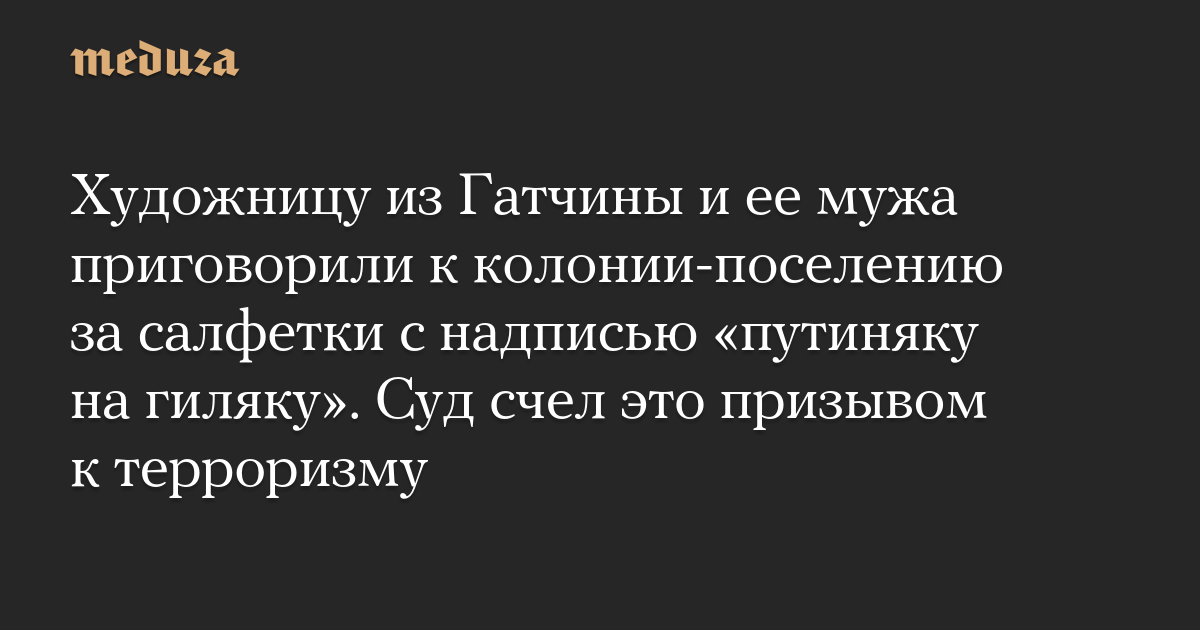 Художницу из Гатчины и ее мужа приговорили к колонии-поселению за салфетки с надписью «путиняку на гиляку». Суд счел это призывом к терроризму