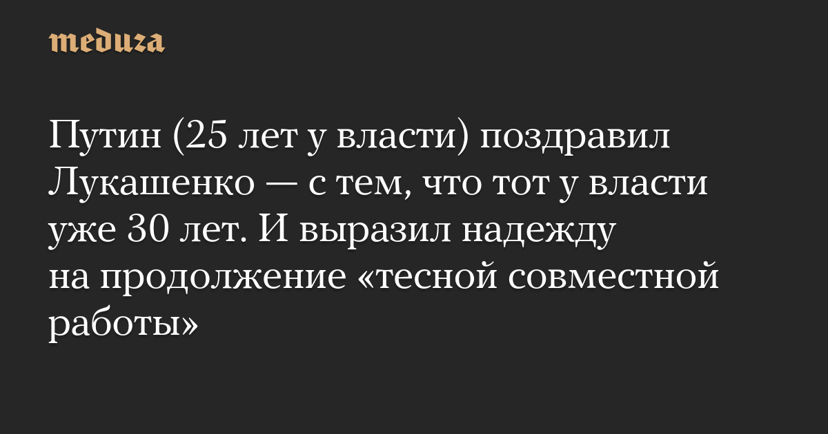 Путин (25 лет у власти) поздравил Лукашенко — с тем, что тот у власти уже 30 лет. И выразил надежду на продолжение «тесной совместной работы»
