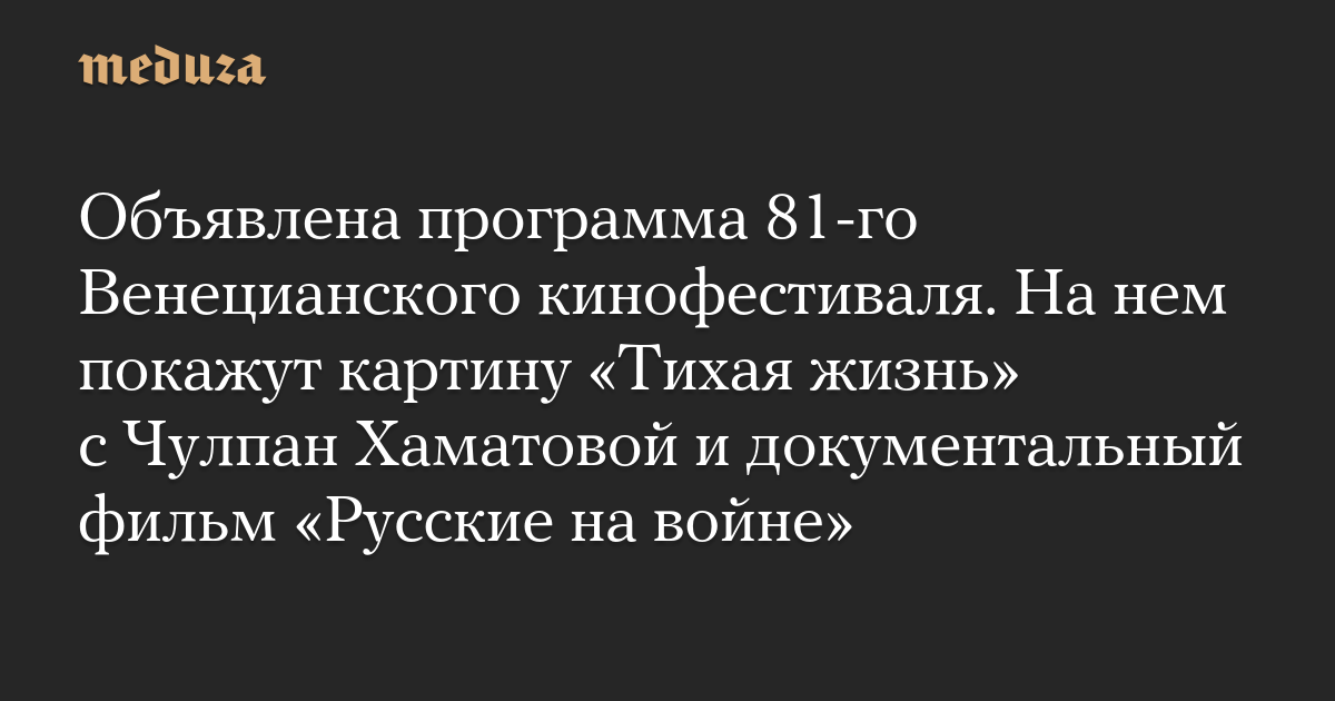 Объявлена программа 81-го Венецианского кинофестиваля. На нем покажут картину «Тихая жизнь» с Чулпан Хаматовой и документальный фильм «Русские на войне»