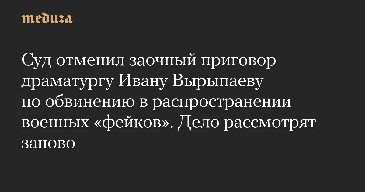 Мосгорсуд отменил заочный приговор драматургу и режиссеру Ивану Вырыпаеву, обвиненному в распространении «фейков» об армии РФ, и отправил дело на новое рассмотрение. Об этом РИА Новости сообщил источник в правоохранительных органах.