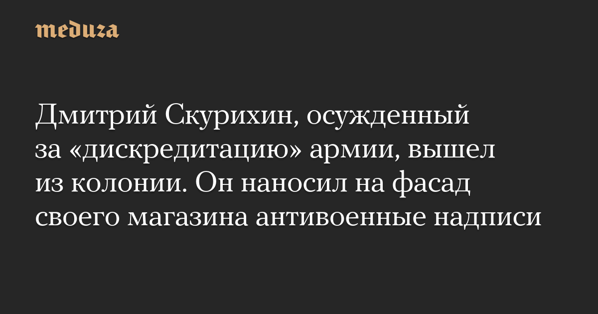 Предприниматель Дмитрий Скурихин из Ленинградской области, расписывавший свой магазин антивоенными надписями и осужденный по делу о повторной «дискредитации» российской армии, вышел на свободу из колонии, сообщает петербургская «Бумага».