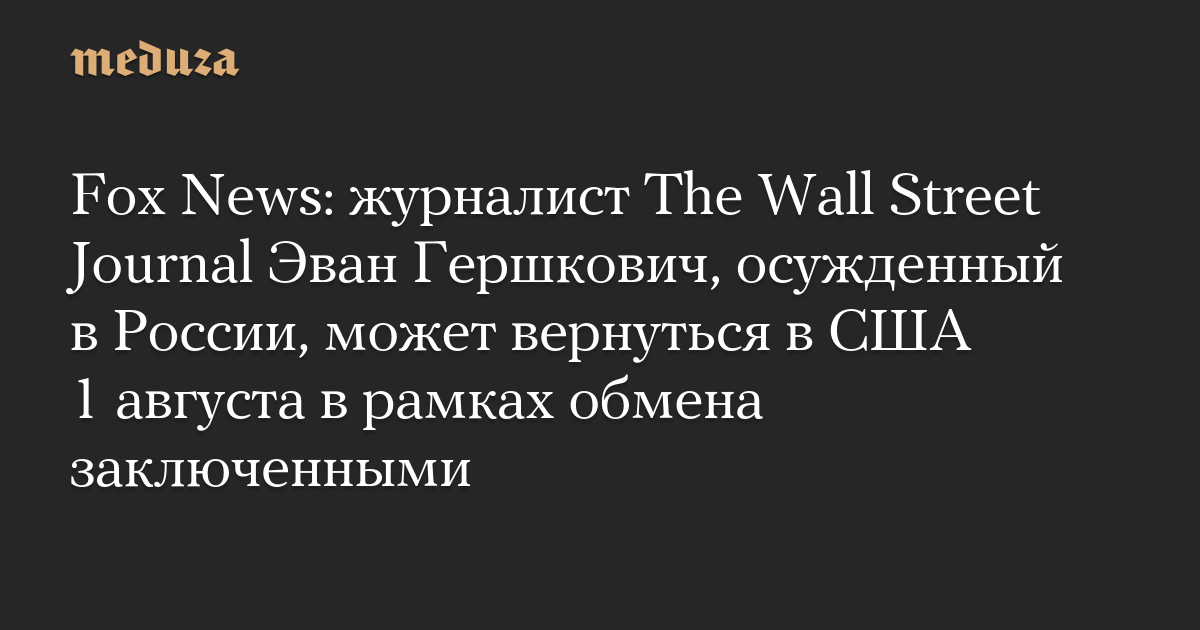 Американский телеканал Fox News сообщил, что корреспондент The Wall Street Journal Эван Гершкович, которого в России осудили по обвинению в шпионаже, может вернуться в США 1 августа.